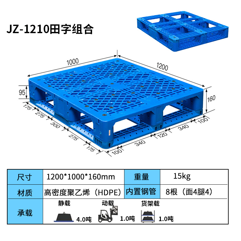 1210田字組合款塑料托盤,可上立體庫貨架,內置芯片槽設計 田字設計,雙層加強受力,增加托盤受力強度,使受力更加均勻,結構牢固,不易變形。完美無障礙平地堆碼,疊放易于整理存放,也可節(jié)約存儲空間,符合空間資源合理配置要求。可四向進叉,操作方便,多